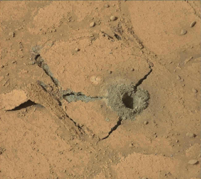 Несмотря на то, что плитка разрушилась, было собрано достаточное количество грунта для анализа приборами CheMin и SAM бортовой лаборатории